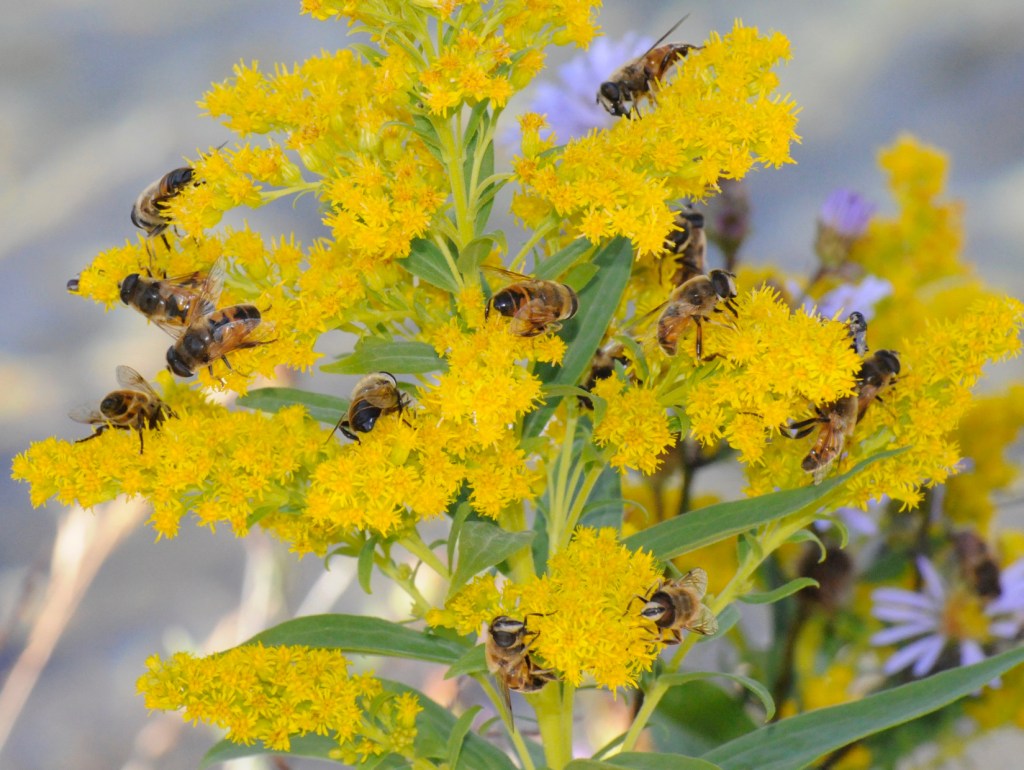 Pictured below: Eristalis tenax drone flies visiting goldenrod flowers. Image credit: Elizabeth Jones.