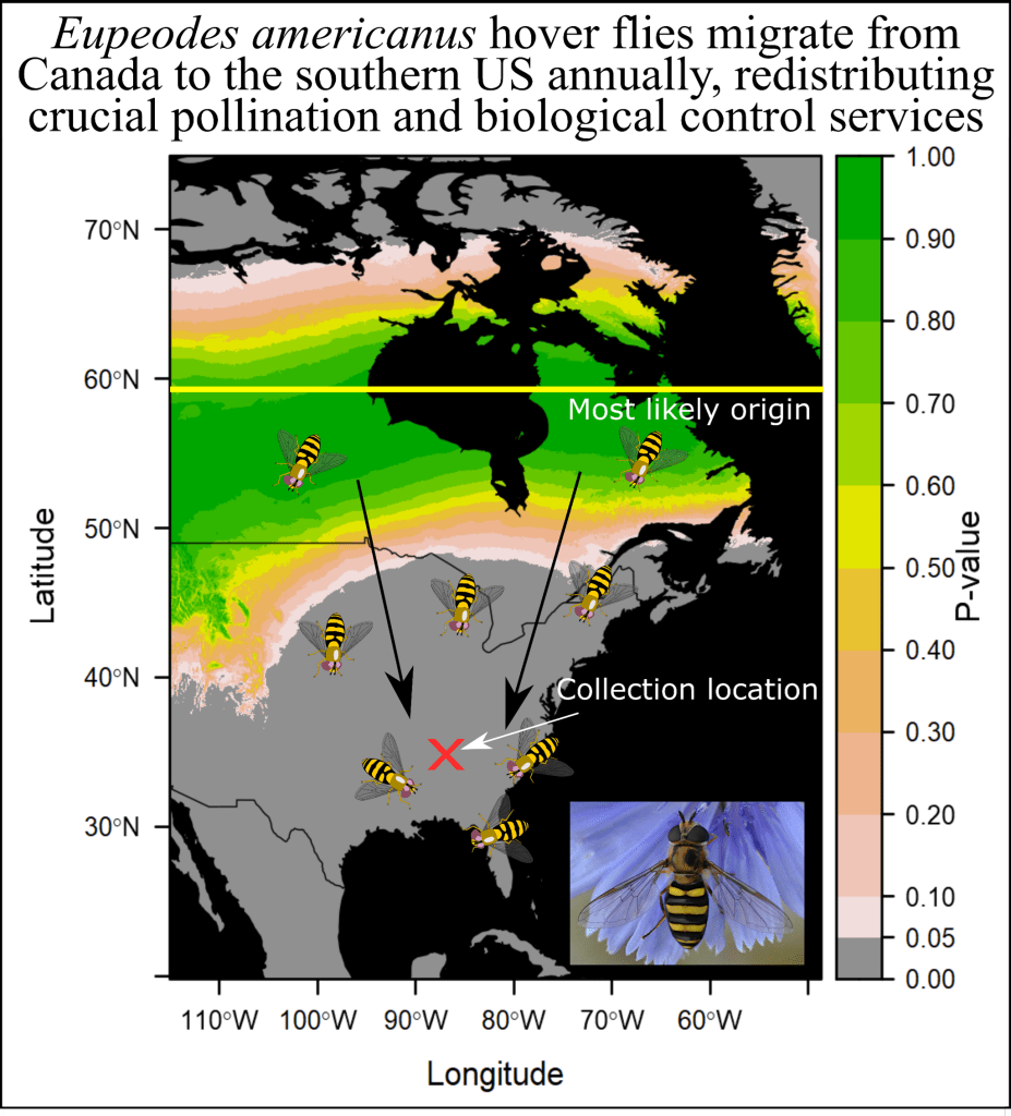 Many insects are known to exhibit long-distance, seasonal migration, and we are just beginning to uncover the true extent of these phenomena. Much of Dr. Clem’s research is focused on the long-distance migration of Nearctic hover flies (Diptera: Syrphidae). Using stable hydrogen isotopes, he discovered that common North American hover fly species, such as Eupeodes americanus, migrate from the upper Midwest and Canada to at least the southeastern United States during autumn. Furthermore, there are morphological, behavioral, and physiological mechanisms which may be linked to this. These findings are likely to have major ecological and economic consequences, given that these insects are important pollinators and biological control agents.